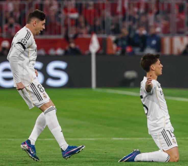 第29分钟,皇马再次进球!居莱尔任意球直接射门,皮球越过人墙,钻入球门右上角!居莱尔竟然梅开二度。第38分钟,凯恩在禁区内推射破门,再次扳平比分。3分钟后,维尼修斯射门击中门框弹出。第42分钟,皇马再次领先。维尼修斯突入禁区后送出横传。姆巴佩后插上,得球后单刀推射破门。半场结束,皇马3-2领先拜仁。